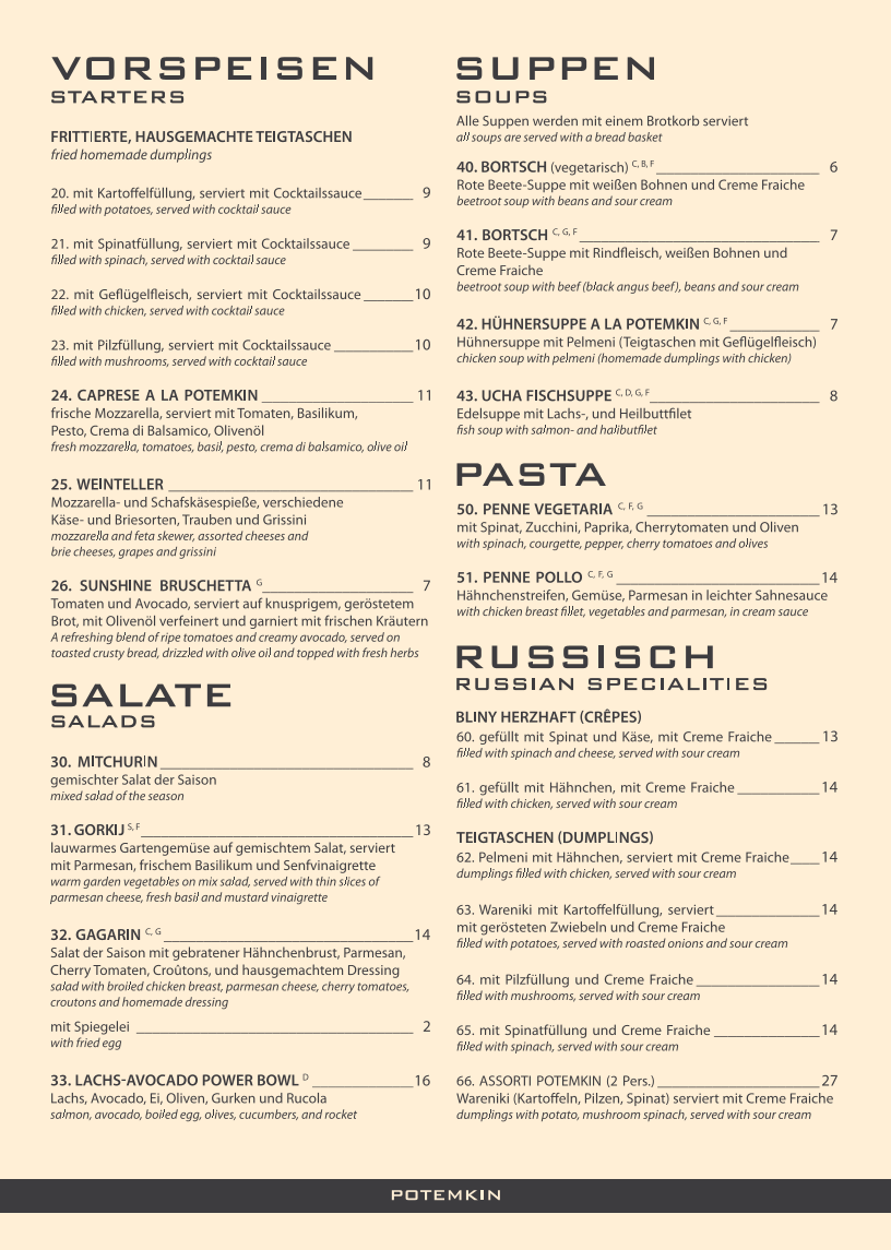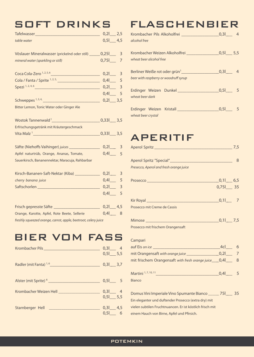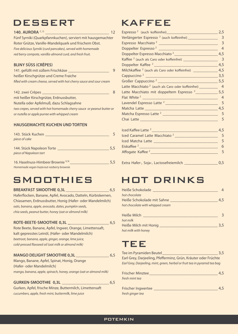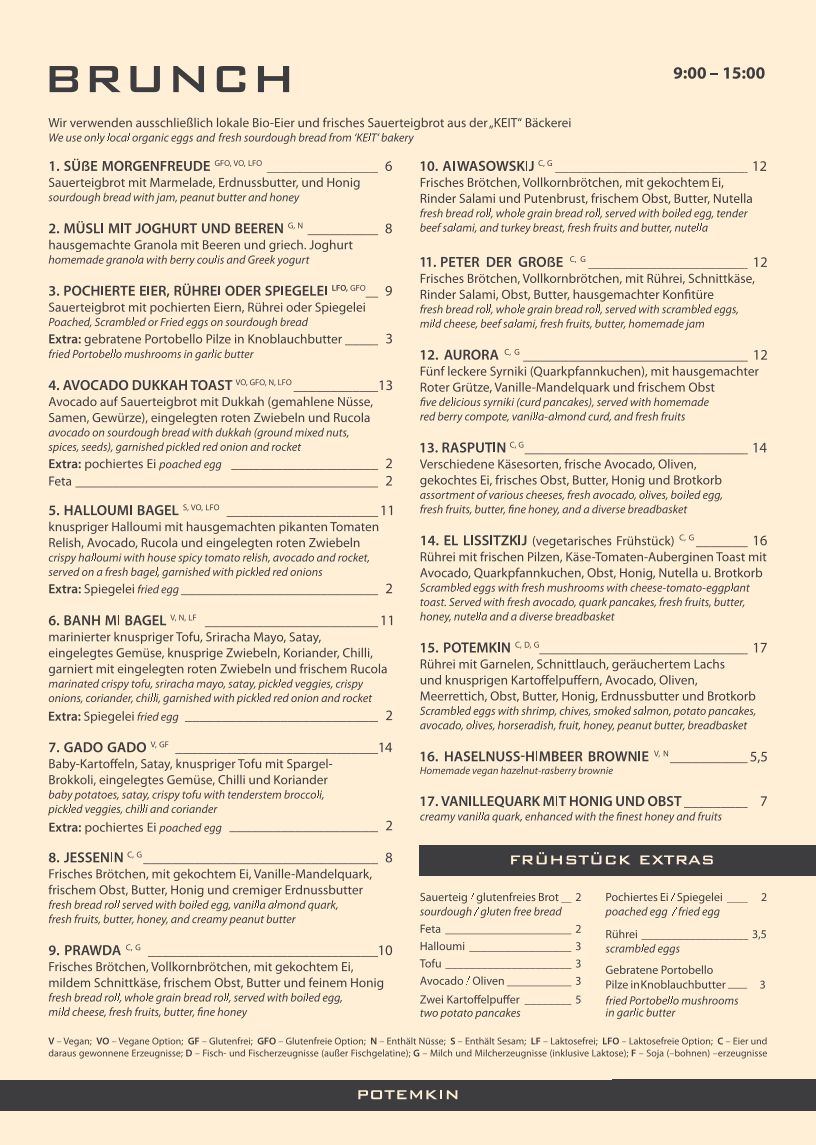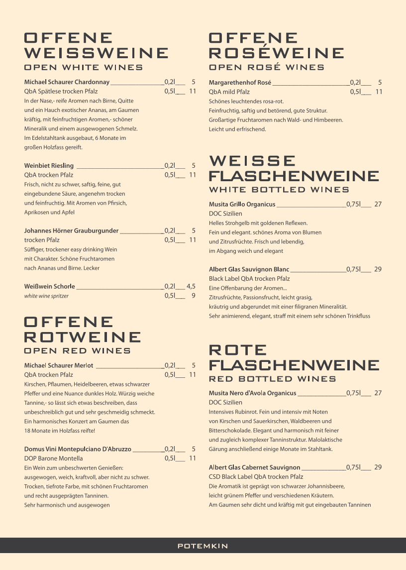 Welcome to Potemkin Restaurant Berlin, a Mediterranean gem nestled in the heart of Berlin at Viktoria-Luise-Platz. This inviting eatery delights guests with a thoughtfully curated menu that celebrates fresh, authentic flavors. Begin your day with their luscious Süße Morgenfreude, featuring sourdough bread paired perfectly with homemade jam, peanut butter, and honey. For brunch enthusiasts, the homemade granola with berry coulis and Greek yogurt is not to be missed.
